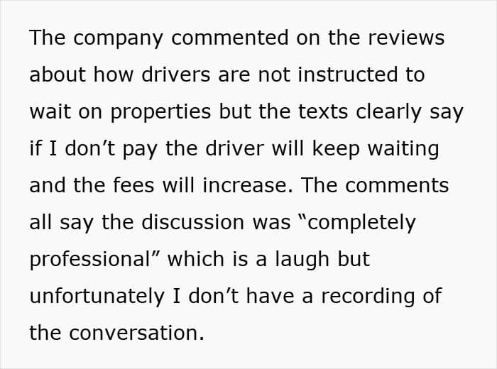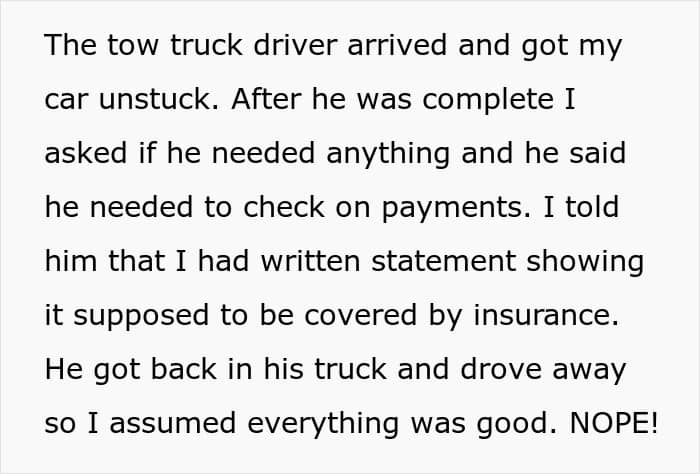 Well, the woman went ballistic after hearing this and started screaming about how that’s not the way it should have been done, and even threatened to put his car back in the ditch! He also got a message that they were charging him an additional $125 as a “waiting fee” even when he clarified that nobody was waiting on his property.