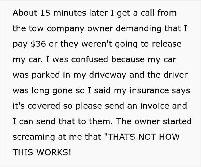 Later, he got a call from the tow truck company that he owed them $36, but when he said that insurance had it covered, the woman started screaming at him