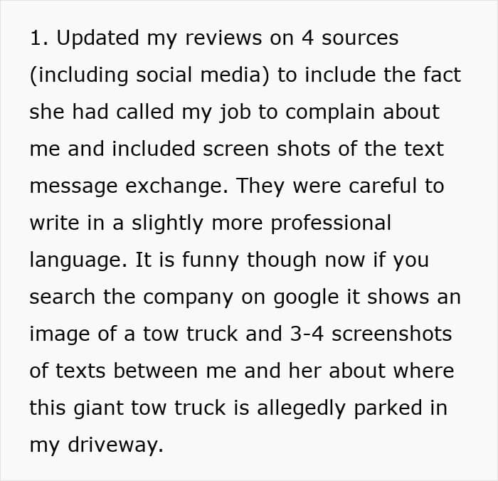 He also posted bad reviews of the tow truck company on multiple sources and even shared screenshots of the text messages with the woman