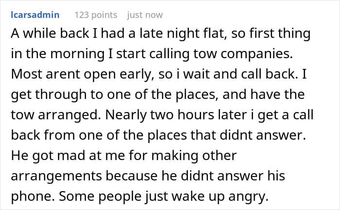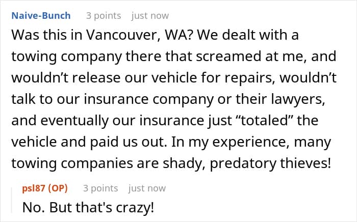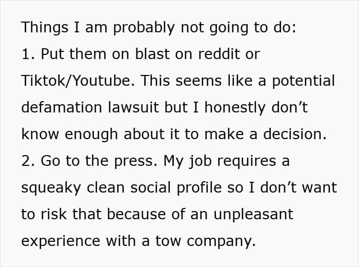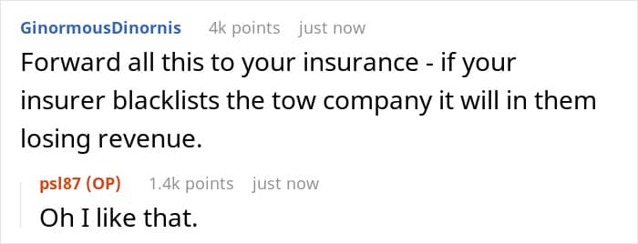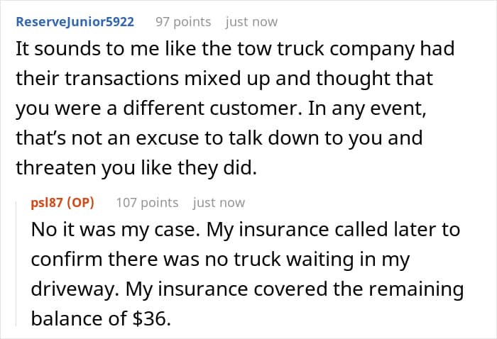 In the end, his insurance company did pay the $36, but the bizarre incident made the poster realize how unprofessional the tow truck company was and that the woman was a complete bully. He reached out to Redditors and sought some ideas about how he could take his revenge.