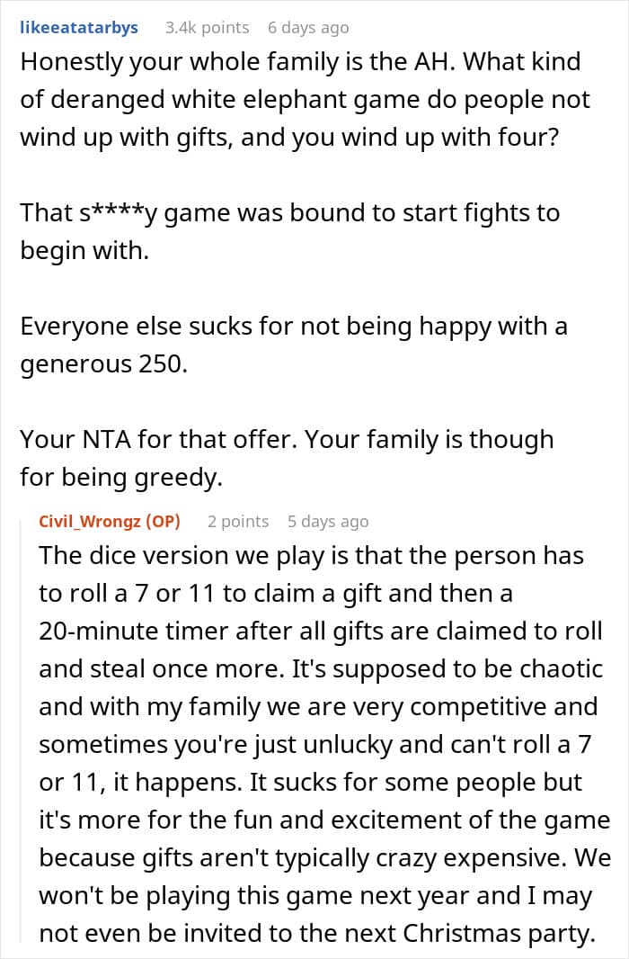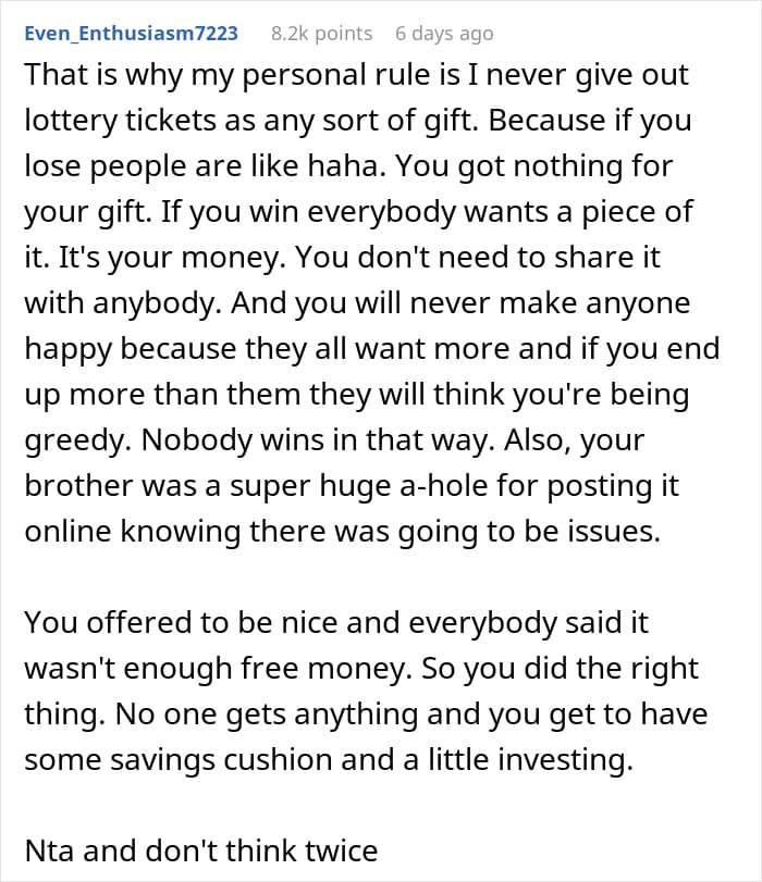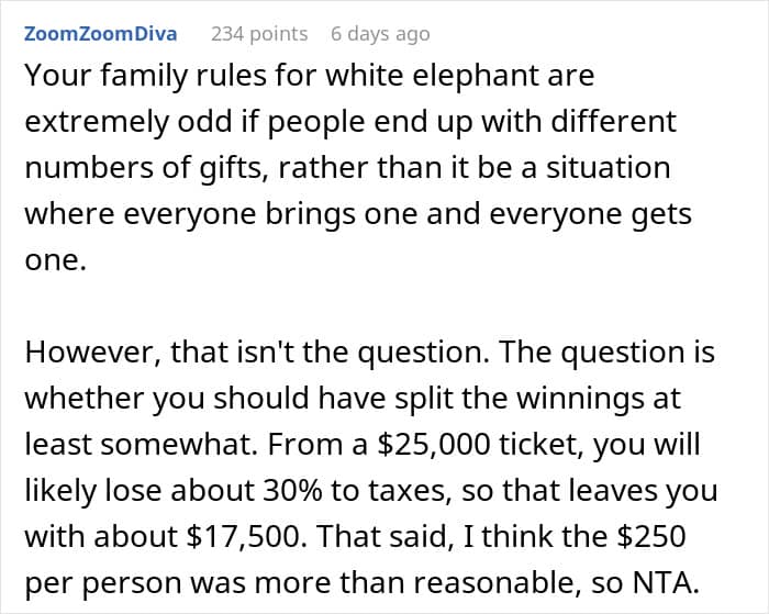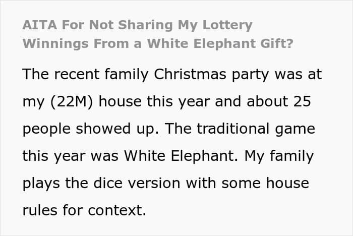 But there’s two sides to this coin, as such winnings often entail things that are far from positive. Take this redditor’s story, for instance. After trading a gift during the White Elephant gift exchange with his family, the 22-year-old was left with some lottery tickets, one of which ended up adding $25,000 dollars into his bank account. But in addition to the money, the ticket also brought disagreements within the family, some of whom were calling the OP cruel and heartless. Scroll down to find the full story below.