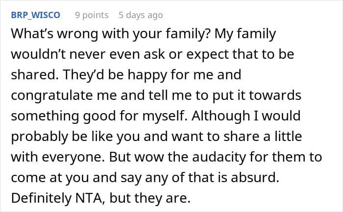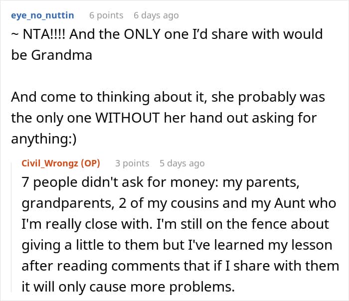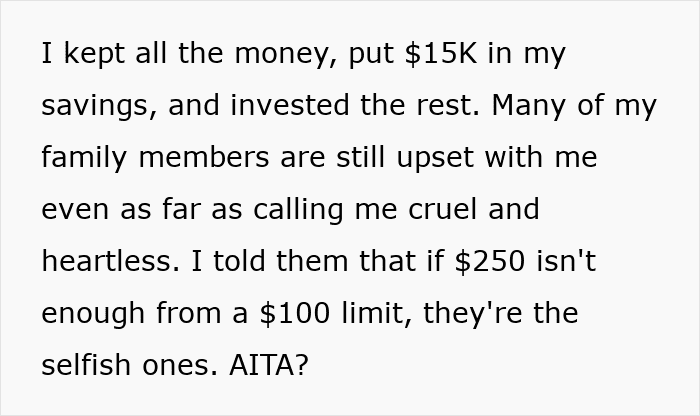 For the OP, the relationship with some family members became strained from day one of them learning about the young man’s winnings. Many of his kin—excluding his parents, his grandparents, two cousins, and his aunt—felt entitled to a share of his prize, and for some, $250 wasn’t enough.