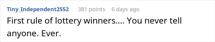 While it might be difficult to keep it from your partner, when it comes to others, many people suggest refraining from sharing the information after winning a significant amount of money. (Even though, as the joke goes, “I might not tell, but there will be signs”.) Some people in the comments seconded the idea that it’s better to keep the news to themselves, while others focused more on assuring the OP that he wasn’t being a jerk in the situation.