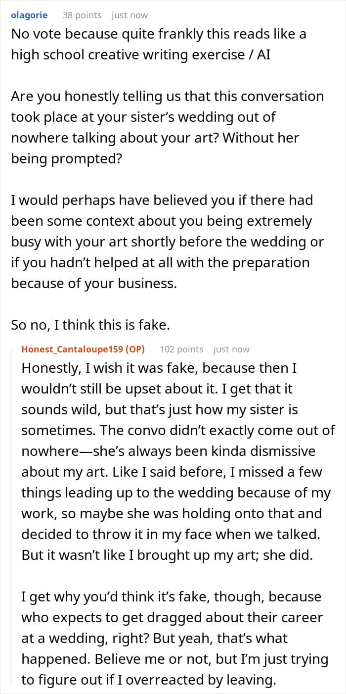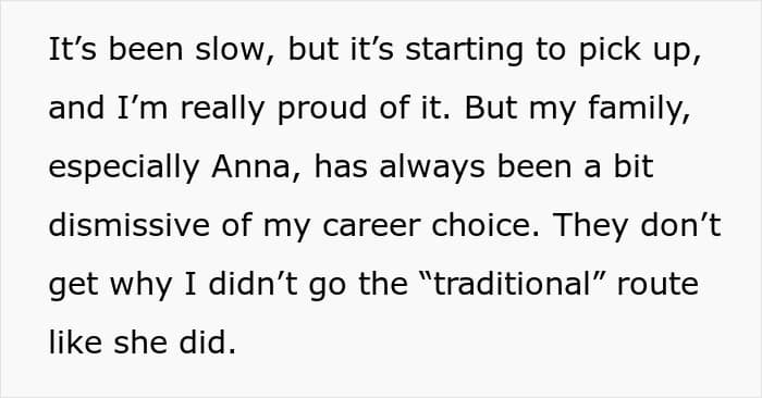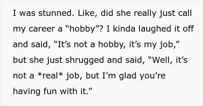 And if the original poster was counting on support from the folks online, then she received it in full. “Your sister’s comment was hurtful, especially since you were there to support her on her big day. Calling your career a ‘hobby’ undermined the hard work and passion you’ve put into your art,” another person added in the comments. And do you, our dear readers, also agree with this interpretation of events?