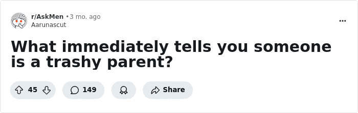 The original thread appeared two months ago in the AskReddit community with the question: “What instantly tells you someone is a trashy parent?” As of today, it has 3.3K upvotes and over 4K different views and thoughts from commenters. Some people simply state their point of view, some share a story from their childhood or parenting, and some just recall an incident they saw once.