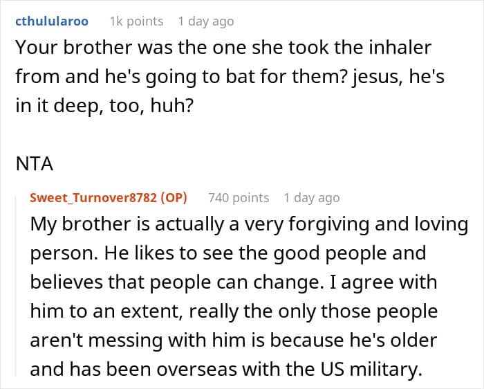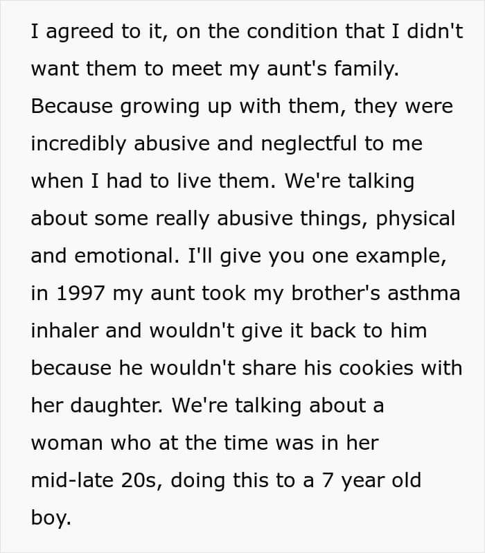 And honestly, given that this aunt once thought it was totally fine to snatch an asthma inhaler from a 7-year-old for not sharing his cookies, the request didn’t seem like much of an ask. How hard can it be to keep the drama under control for one day?