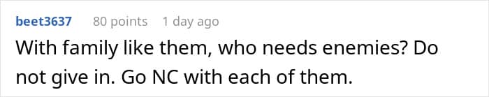Even better, the aunt’s posse chimed in with their usual victim routine, labeling our dad as ungrateful. Oh, the irony! Toxic relatives sure love to flip the script when they’re the ones breaking the rules, don’t they? But Dad wasn’t having it and he blocked all communication with his parents. I’m pretty sure I would have done the same thing if I were in his shoes.