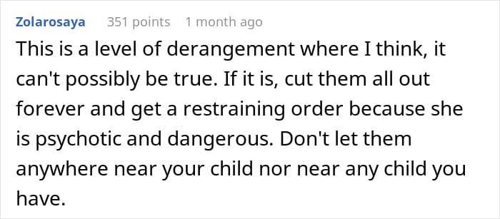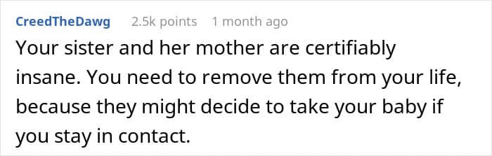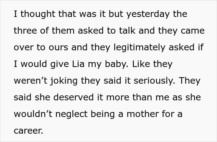 For example, a woman shared her shock at learning that her family, instigated by her jealous sister, legitimately wanted her to hand over her baby. For some absurd reason, they believed she would be a poor mother, not have time for the child, and that her life was good enough anyway. OP, naturally, kicked them out of the house and vented her feelings to the internet.
