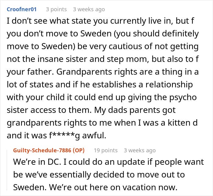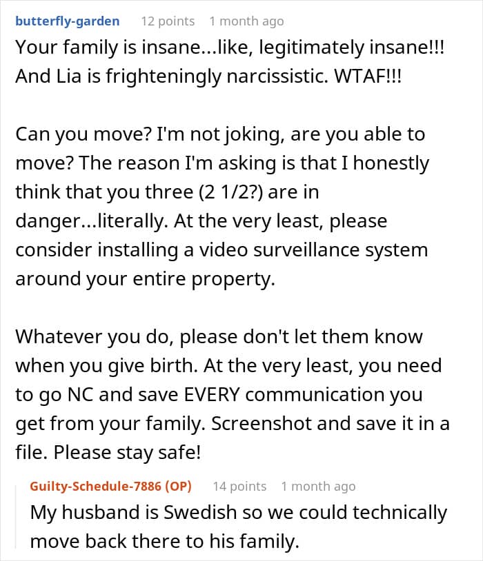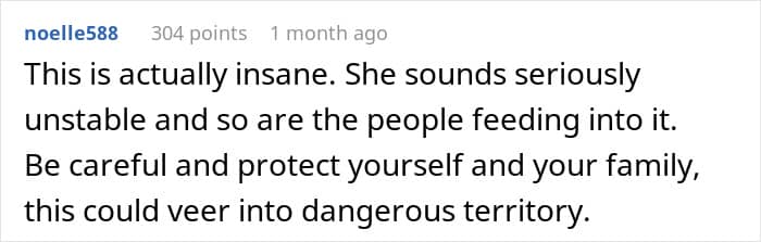 OP has suggested the possibility of moving away to escape from a family that so readily indulges in the sister’s delusions. While by itself, this encounter is weird and uncomfortable, there is also the risk that it won’t be the last. Unfortunately, people with a skewed perception of reality and their own “rightness” might not stop at a simple no, so OP might be correct to try and protect herself and her family. Ultimately, the sister needs therapy and parents who make her face reality and move on with her life, instead of making demands of their other child.