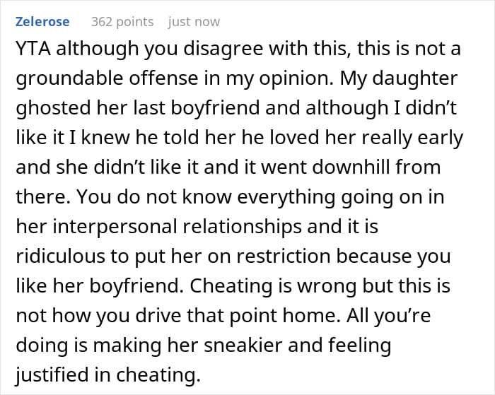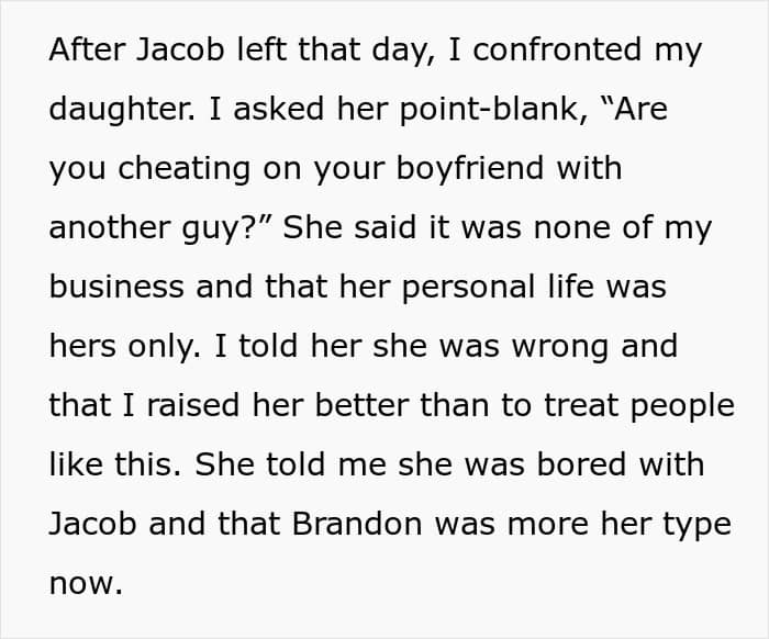 The OP eventually decided to confront her daughter, and she didn’t deny her actions. Instead, she brushed it off, claiming that it was her life and her business. She also admitted that, although her boyfriend no longer excited her, she wasn’t ready to commit to the guy she was cheating with.