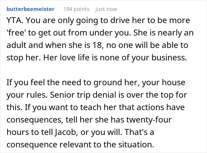 Today’s Original Poster (OP) was shocked when she found out her daughter was cheating on her boyfriend. When she grounded her and told her she wasn’t allowed to go on a senior trip coming up, it caused a bit of drama.
