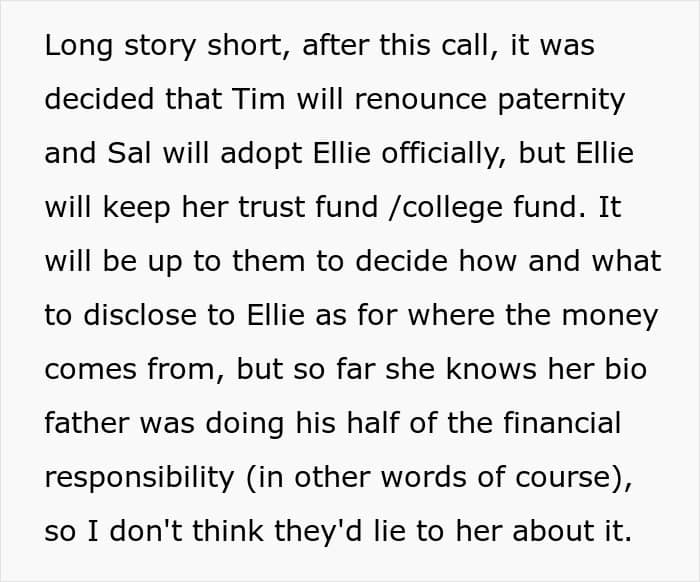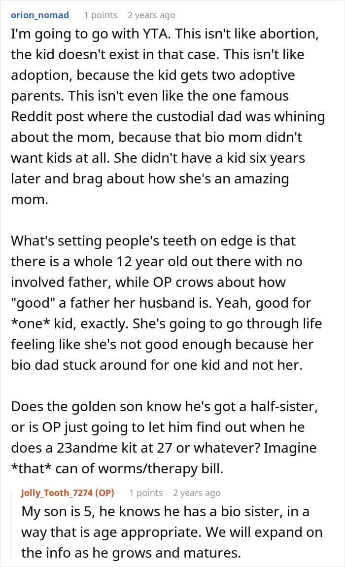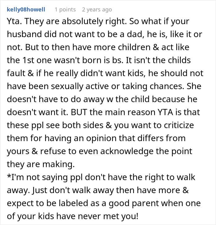 Redditor Jolly_Tooth_7274’s husband made a conscious decision to completely cut ties with his biological daughter before meeting her. The current wife is aware of the whole situation, and he supports the child financially. But he has never seen her, nor does he plan to. Now the couple has a son together, and she believes that her husband’s past doesn’t interfere with him being a good father, which some of their friends found to be absurd.