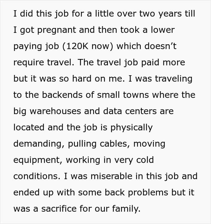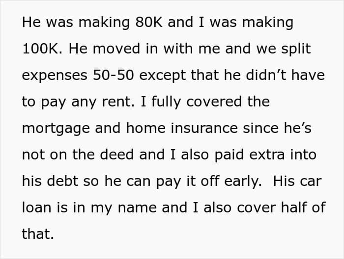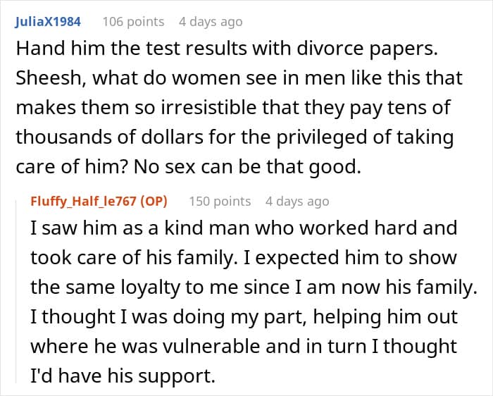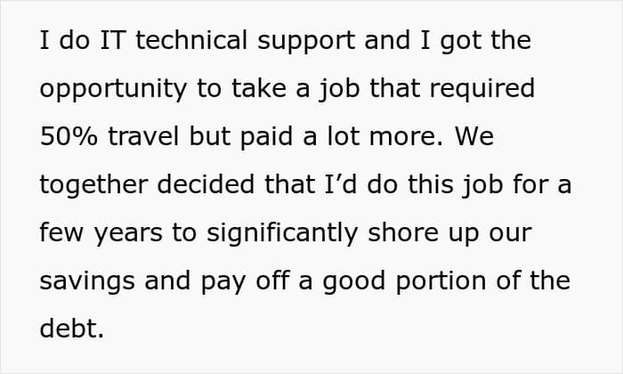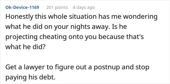 In her own words, she has done a lot for him, which appears to be true. This is perhaps why this demand for “proof” of loyalty feels so painful, when she has literally taken on his debt. While we don’t know enough to say definitively, it also seems like a self-tell, that the man would even consider that a person with a traveling job would immediately cheat at the first opportunity.