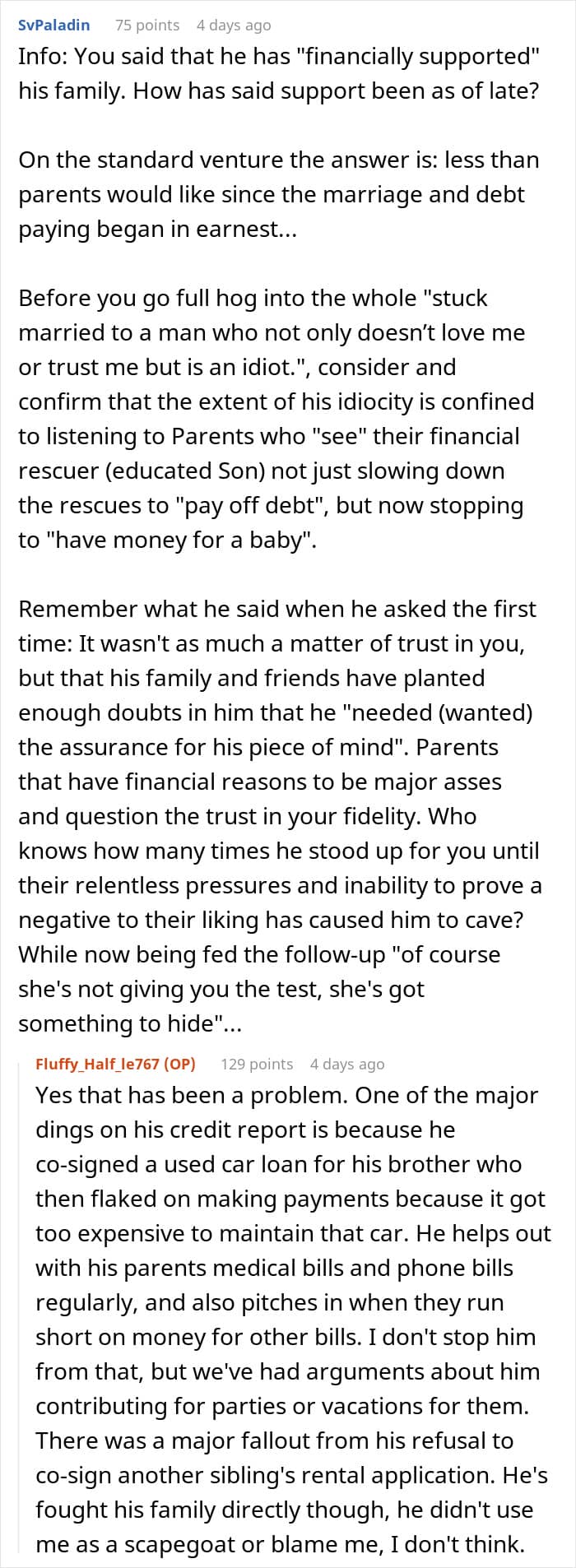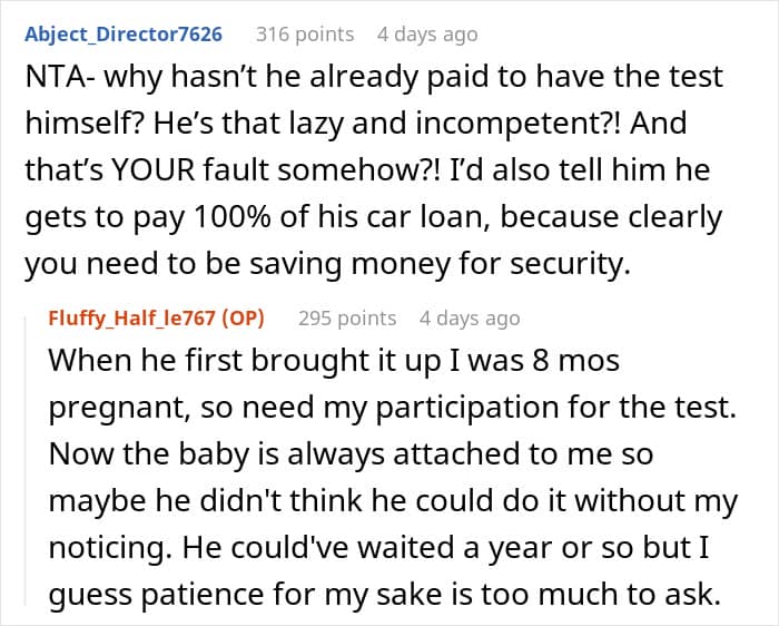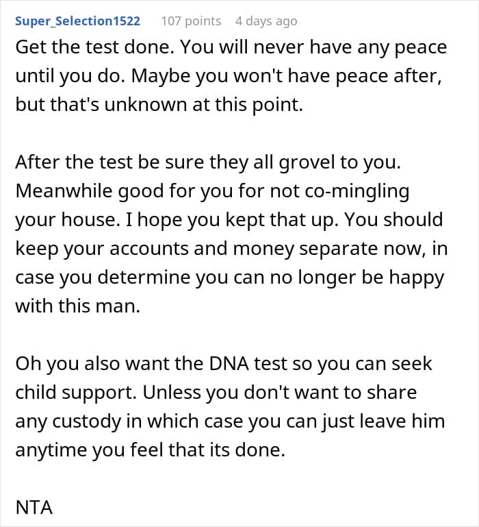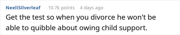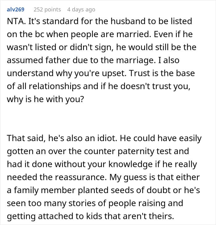 One reason many commenters were divided on this story is that the paternity test is secondary. Yes, it is easy to do, but the demand itself, coupled with the instance of being “tricked” with the birth certificate would show that something is off in this relationship. You don’t accuse your spouse of deceit lightly and without evidence, unless you are ok with straining the relationship forever.