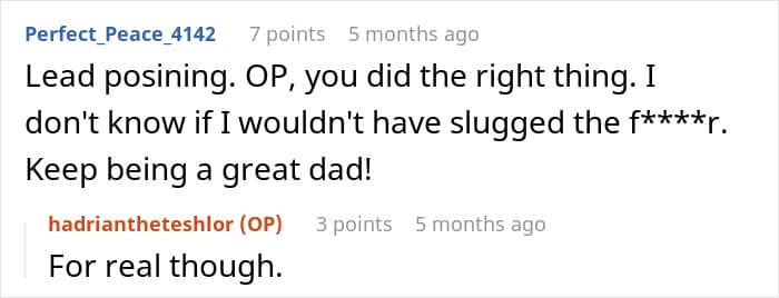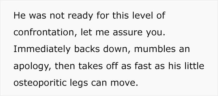 The stranger started defending himself by stating that the kid was blocking his path, but the poster was not gonna give up. Looking at the determined look on OP’s face, the man backed down, mumbled an apology, and walked away.