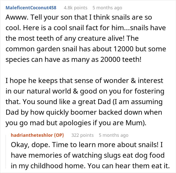 People also found the kid’s fascination quite adorable and shared some interesting snail facts in the comments for the 4-year-old. What about you? What are your thoughts about the story? Also, if you were in the poster’s shoes, how would you have handled the violent old man?