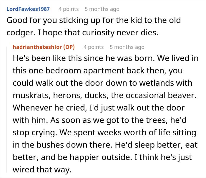 Some also expressed concern about how the kid might’ve felt when all he did was be excited and try to share it with the old guy. However, the poster commented that his son forgot about it pretty quickly and went back to observing the snail.