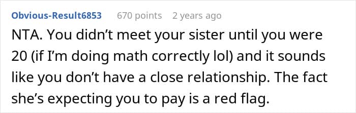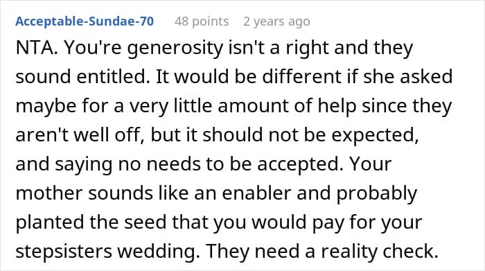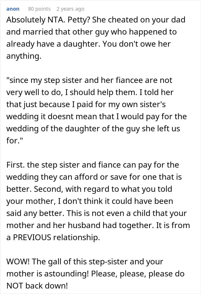 Perhaps instead of burning bridges by repeatedly pressuring the man to pay for it all, the stepsister could’ve found a compromise with him?