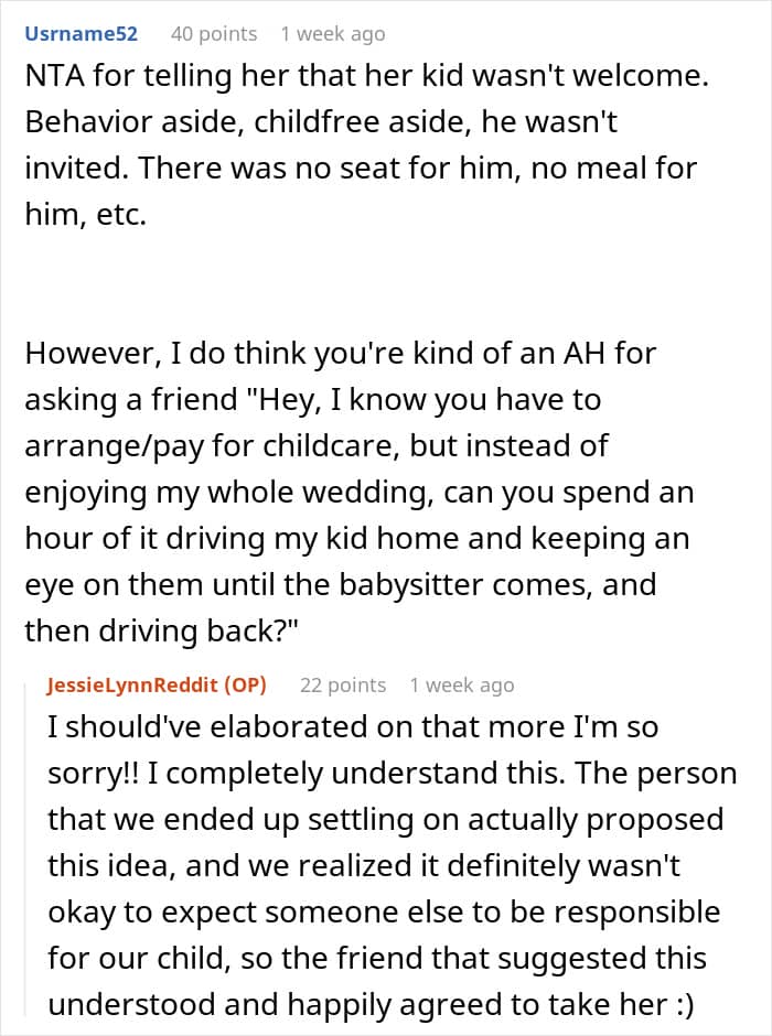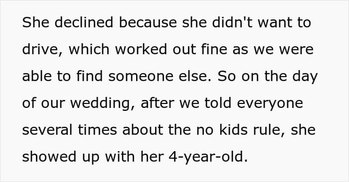 But one woman refused to accept that her friend’s wedding was a child-free occasion, so she decided to show up with her son anyway. Below, you’ll find the full story that the bride recently posted on Reddit, as well as a conversation between the bride and We.