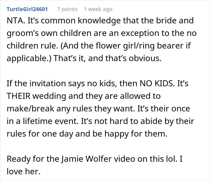 “You wouldn’t believe the amount of people who are acting like I requested they throw their kids off a bridge or put them up for adoption,” she shared. Apparently, some of her guests even insisted that they would still bring along their little ones if they couldn’t find child care.