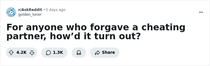 For many couples, there’s no going back from this, but for some, there might be a path forward. The folks in this list are those who’ve been the victim of their partner’s infidelity and still chose to stay with them. They share what happened after forgiving the cheater.
