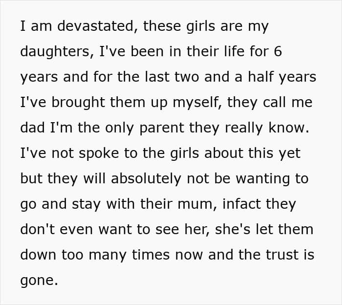 One stepfather got more than he bargained for when his wife suddenly left him. And left her three daughters behind. He and the girls have been living happily together for a while now, and have found their “groove”. But things took an unexpected turn recently. The man received an email from his ex, saying she wants her daughters back. And no longer wants him in their life. The devastated stepdad doesn’t know what to do, and turned to the internet for help.