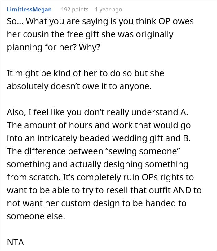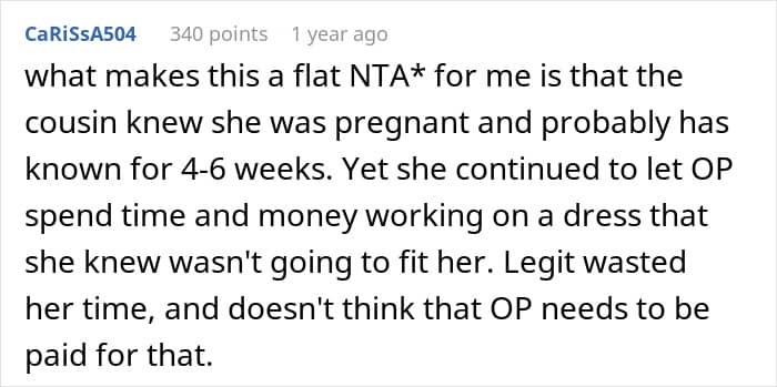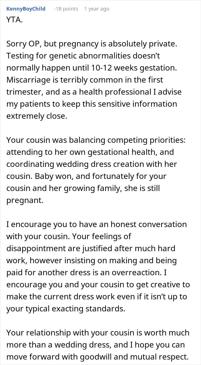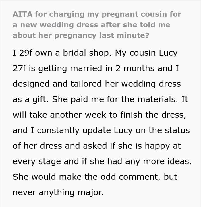 Recently, a woman turned to Reddit to air out her frustration over a fight she’s had with her cousin, who is getting married soon. As the owner of a bridal shop, she designed and tailored a wedding dress as a gift. However, things took an unexpected turn after the bride revealed she was pregnant.