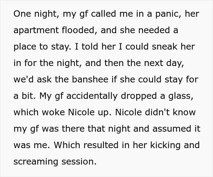 Over the course of several months, Nicole did literally everything to turn our hero’s life into hell. She banged on the wall of his room at night and threw his food out of the refrigerator (citing that it spoiled her food). She accused him of urinating in the shower (although the author swears that he never did this)…