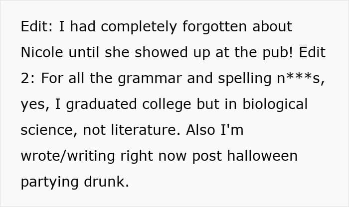 Word for word – Nicole and her husband started recalling how the OP had once shared a roof with her, and went right into badmouthing him severely. Yes, that’s right – telling everyone gathered what a nightmare roommate the author allegedly was. Here, our hero couldn’t stand it – and the beer inside him demanded to unveil the truth too.