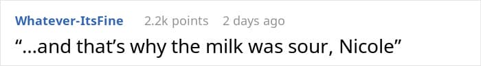 “This is great. Every time you don’t see her and she sees you, just know you are living in her head. For life. Isn’t that great?” one of the responders wrote. “…and that’s why the milk was sour, Nicole,” another person in the comments added wittily.
