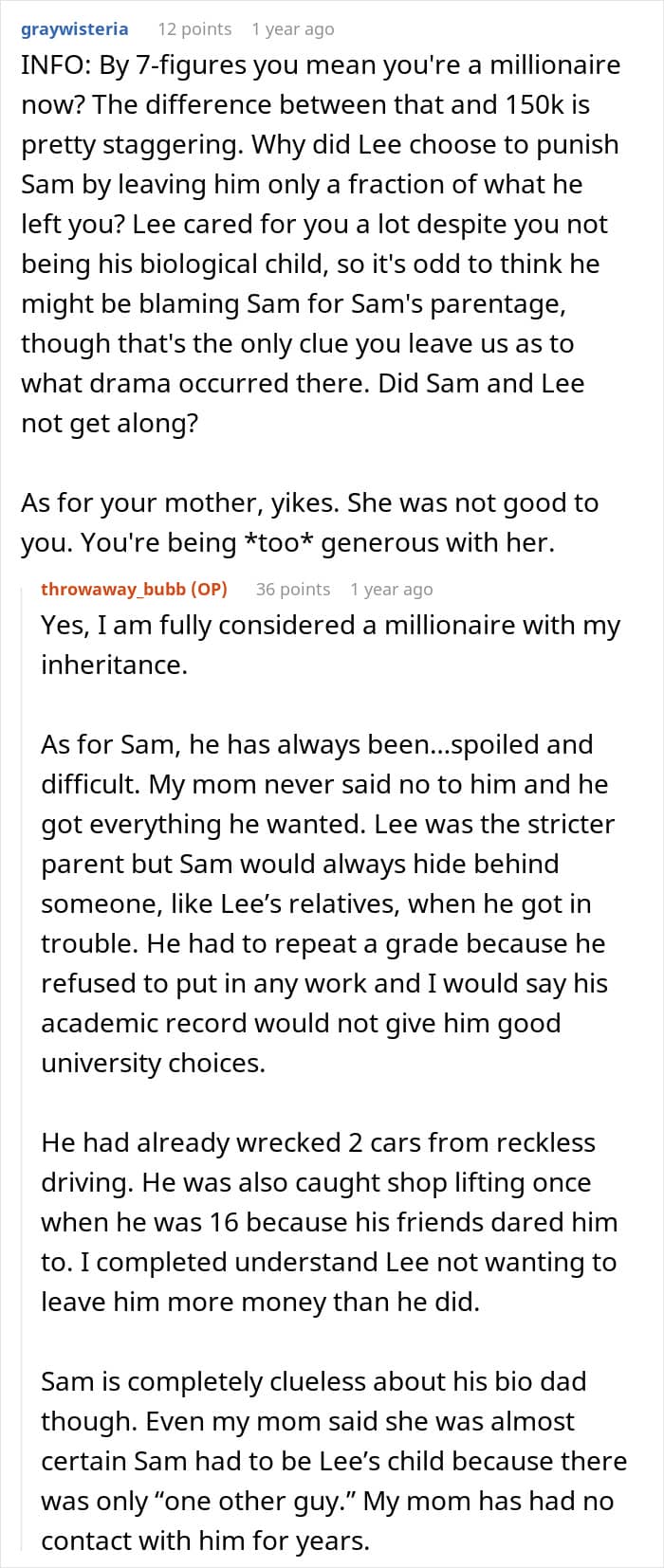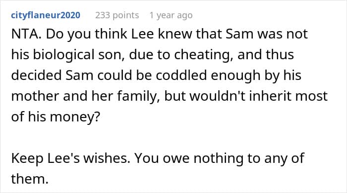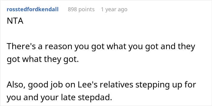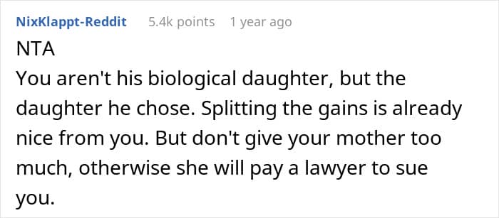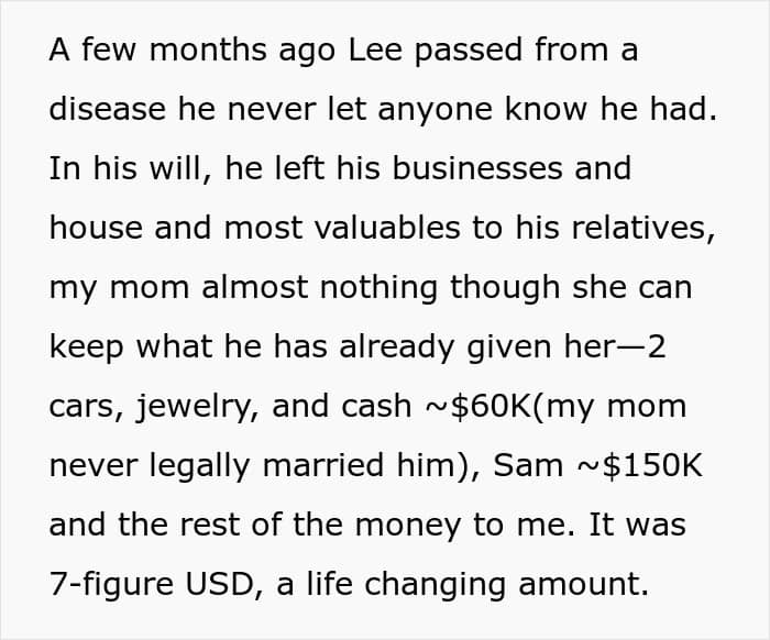 This redditor opted for the latter when she received a 7-figure sum after the death of her stepfather. She refused to divide it and give money to her mother and her brother who demanded that she did. Instead, the young woman offered them a different arrangement, to which they said “not good enough”.