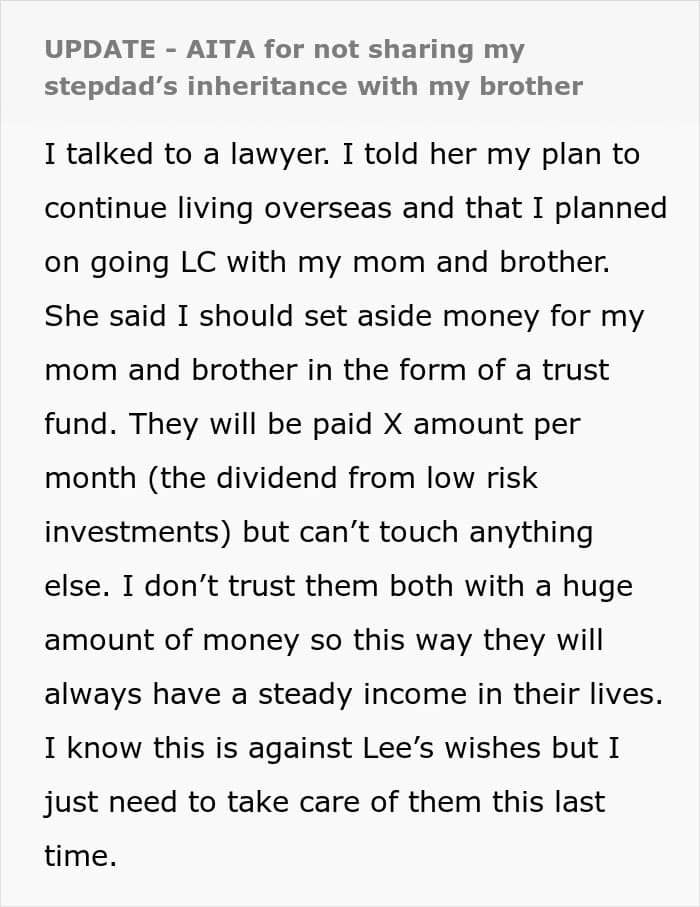 It’s unclear if the OP’s stepfather, Lee, discussed his will with his partner or children. But in an update that the redditor provided later, the young woman revealed that she has discussed her own will with the family and so they know that everything will go to charity. Scroll down to find the update in the OP’s own words below.