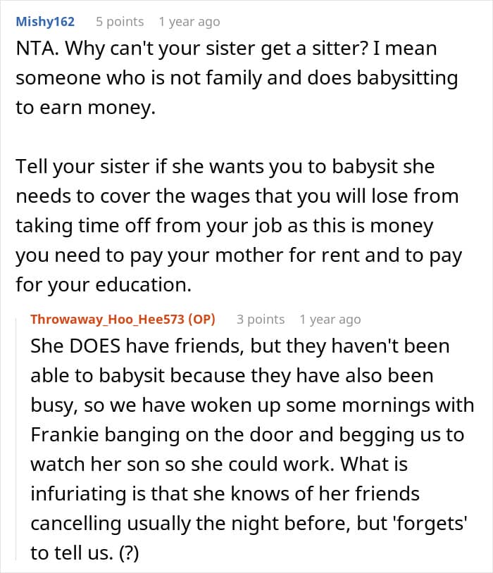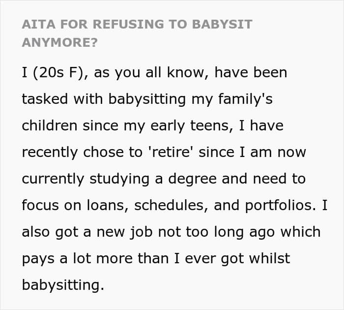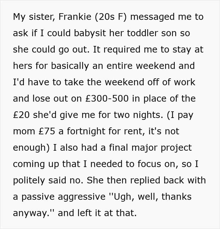 So, the Original Poster (OP) is now 22 years old, she studies in college and works as well, but her relatives seem to perceive her exclusively as a babysitter. Both of her older sisters are single moms, and while “Joanne,” the eldest, always paid her sister extra for taking care of her daughter, the middle one, “Frankie,” never bothered to pay.