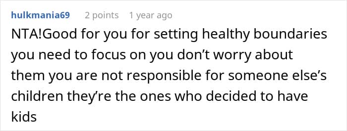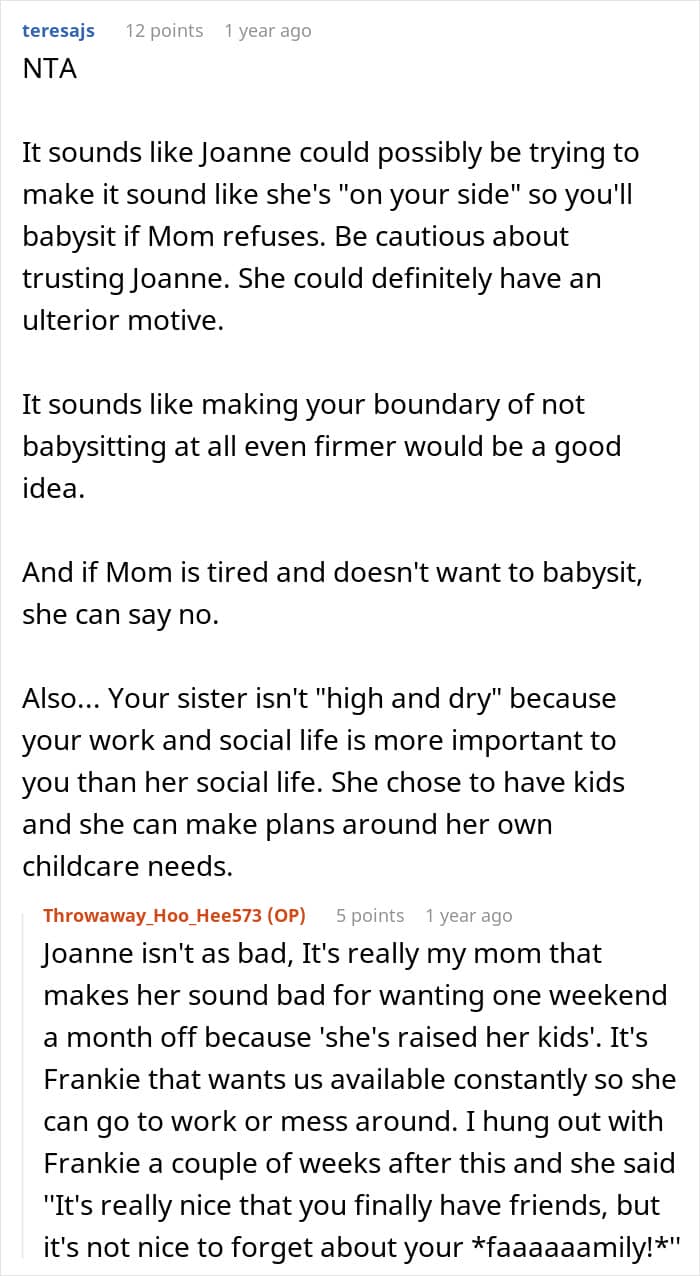 People in the comments unanimously sided with the author and told her that her sisters should find someone else to babysit their offspring
