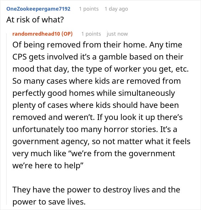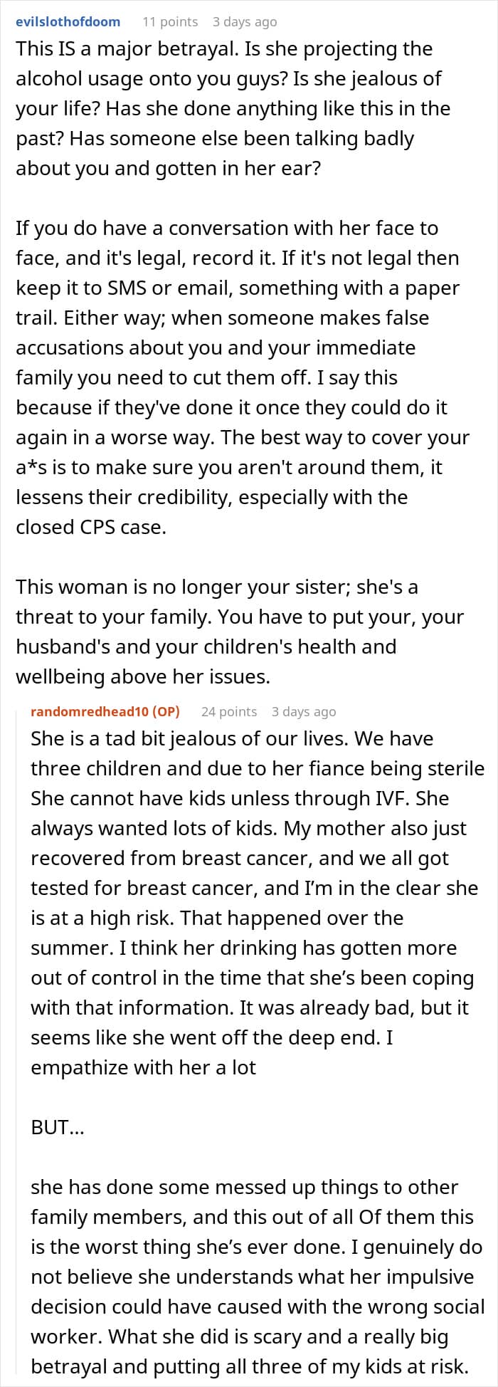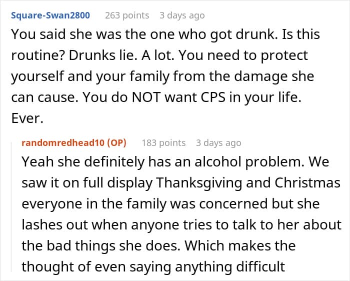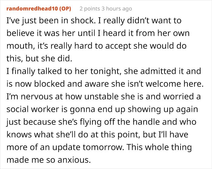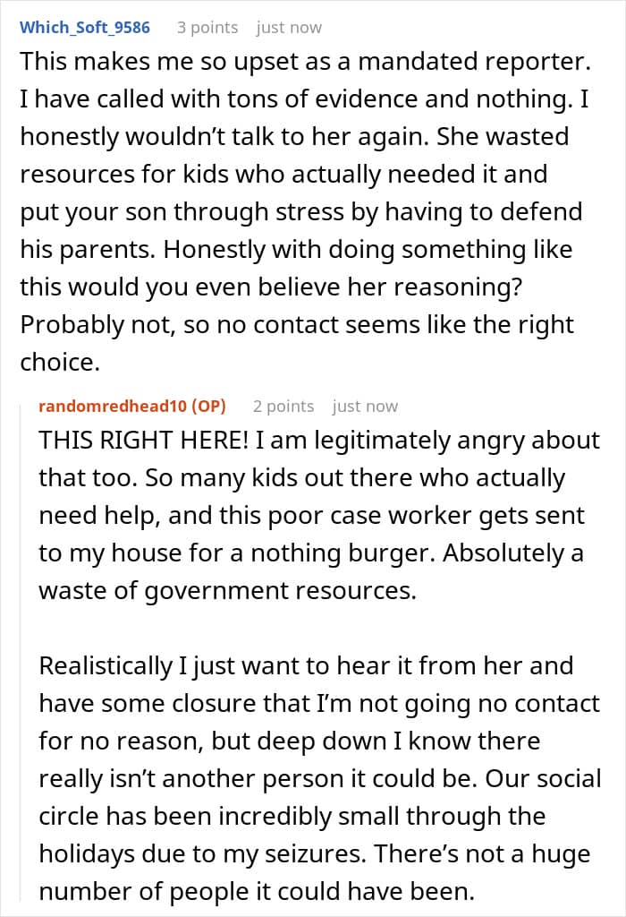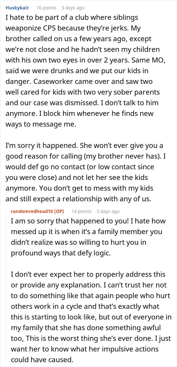 All in all, while it’s unclear why the sister did this, her call to the CPS did way more damage than good. Hopefully, the OP and her family can recover from the emotional and psychological strain of the investigation, and the OP can protect her family from such things in the future.