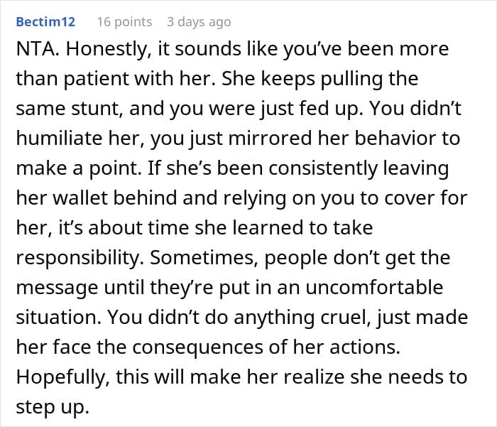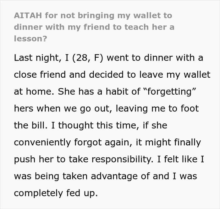 Recently, redditor u/truthinreverse went viral after spilling the tea about her extremely cheap friend who does the same song and dance every time they go out, pretending to have forgotten her wallet. Having finally had enough, the woman decided to call her friend out by giving her a taste of her own medicine. Scroll down to find out what happened and how the internet reacted. We reached out to the author for further comment, and we’ll update the article once we hear back from her.