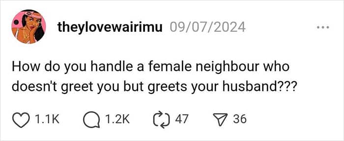 A netizen asked “How do you handle a female neighbor who doesn’t greet you but greets your husband?” and people shared their perspectives. So get comfortable as you scroll through, upvote your favorites and be sure to detail your own thoughts in the comments below.