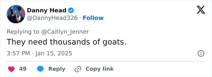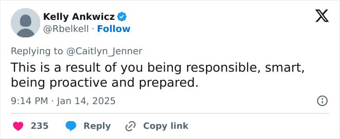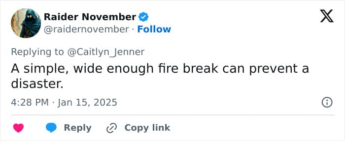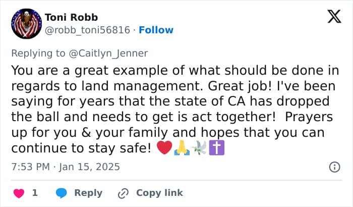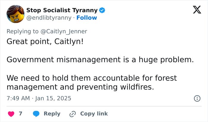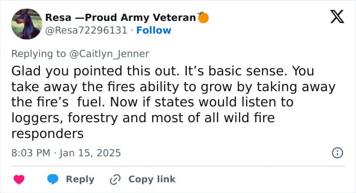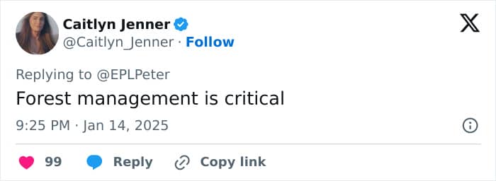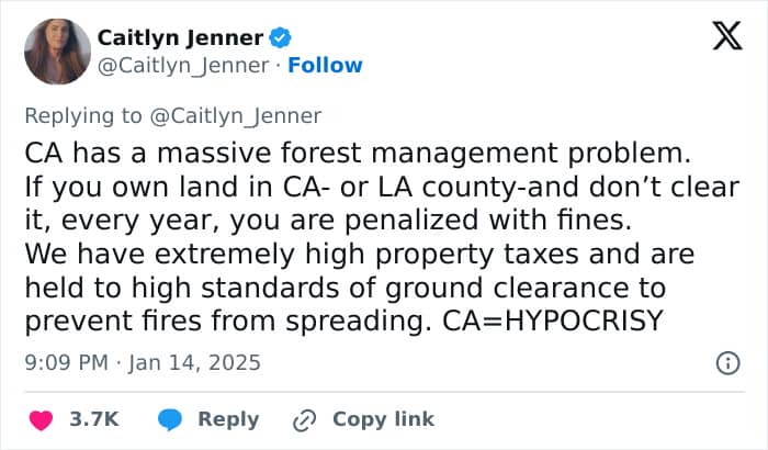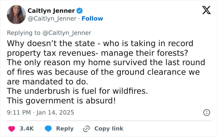 In a separate post, Jenner blasted what she called a “hypocritical joke of a government,” writing, “Everything wrong with LACK OF FOREST MANAGEMENT by the state, on state lands, IN CA. Versus what they make its citizens do for their own land.”