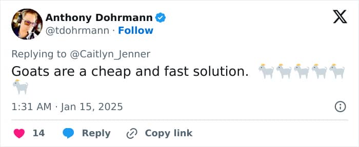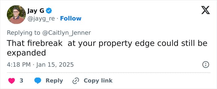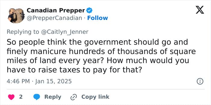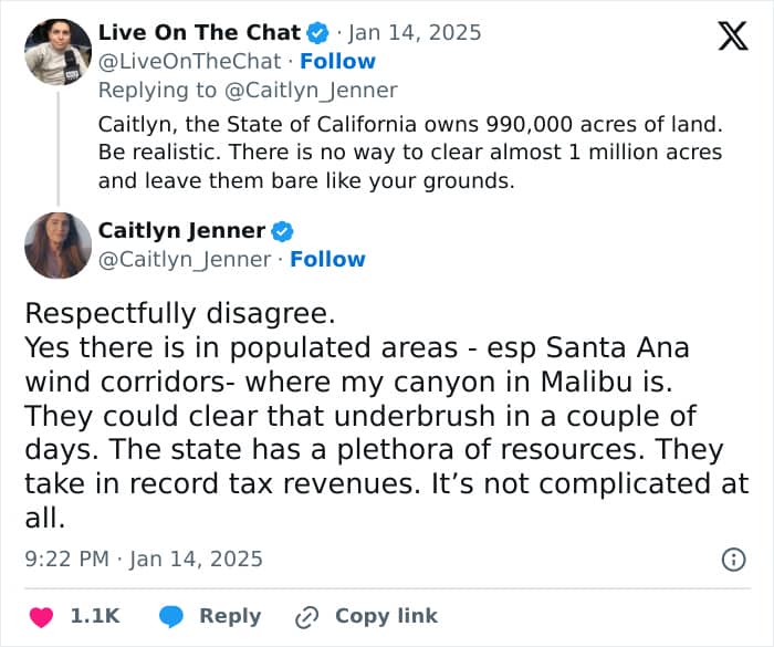 “Be realistic. There is no way to clear almost 1 million acres and leave them bare like your grounds,” one user wrote, to which she responded, “Respectfully disagree. Yes there is in populated areas – esp Santa Ana wind corridors- where my canyon in Malibu is. They could clear that underbrush in a couple of days.”