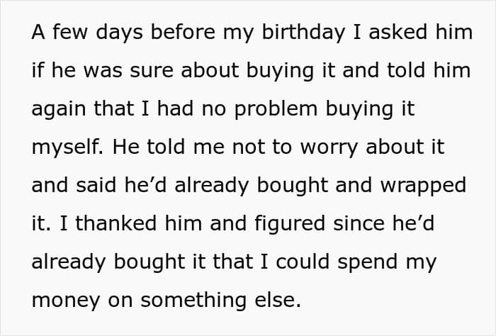 She told him he didn’t have to do that since it’s such a pricey item, but he insisted and said she could spend the money she’d saved up on something nice instead. A couple days before her birthday she checked with him again, but he told her the gift was already bought and wrapped.