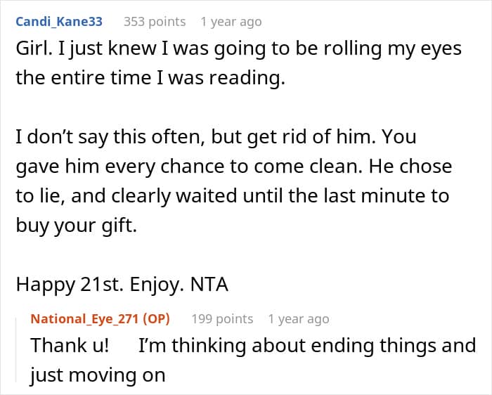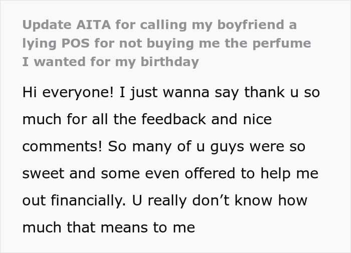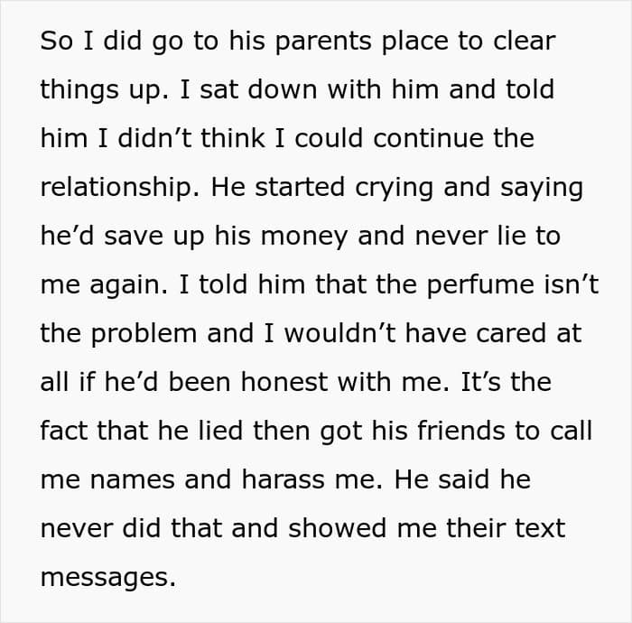 In an update to her original post, OP gives the lowdown about what went down. Apparently, when she threatened to end things, he broke down in tears and apologized profusely to her, saying he’d save up and get her the perfume. OP said at this point, it wasn’t even about the perfume – it was the dishonesty that irked her.