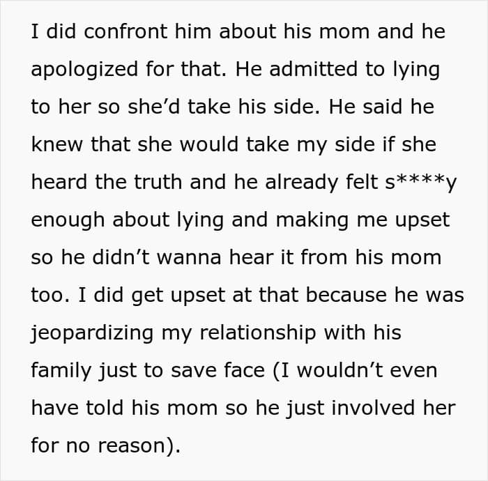 Livid, OP demanded to know why he’d lied to her, but he responded by calling her a spoiled brat. In return, she called him a lying jerk and left. Since then, she’s received a bunch of nasty texts from his friends. Worse still, his mom told her she was being childish.