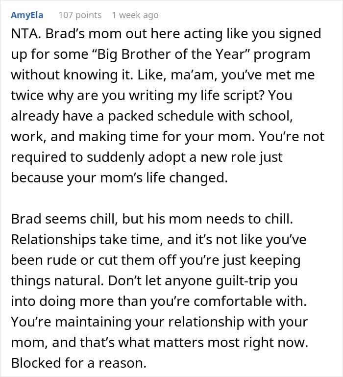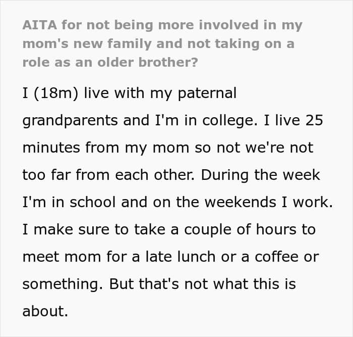 Life has a way of changing fast, and not everyone adjusts at the same pace. This 18-year-old college student was used to it being just him and his mom after his dad passed away. But now that she’s engaged and living with her fiancé and his kids, everyone expects him to take on the role of a big brother. He’s not interested, yet his mom and her fiancé’s family think he’s wrong for keeping his distance. Now he’s unsure if he’s handling the situation the right way.