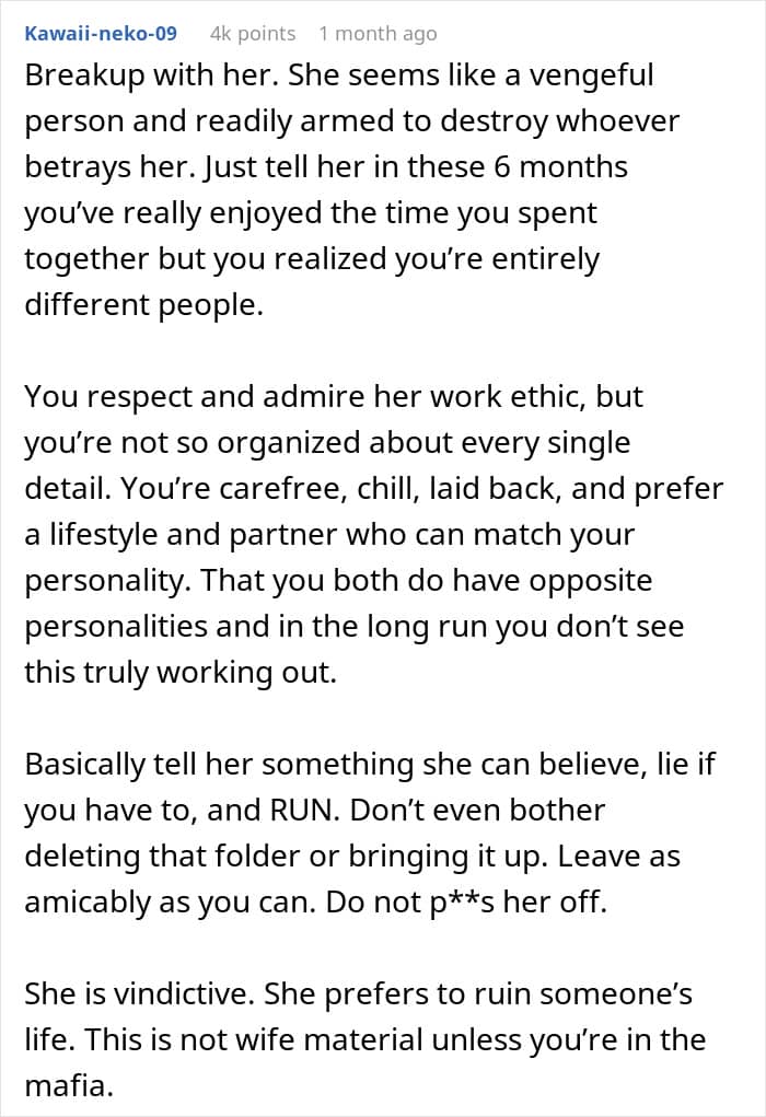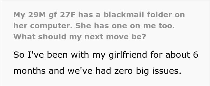 A man had been with his girlfriend for six months when he stumbled upon her “blackmail folder.” What bothered him the most was seeing his initials in one of the files.