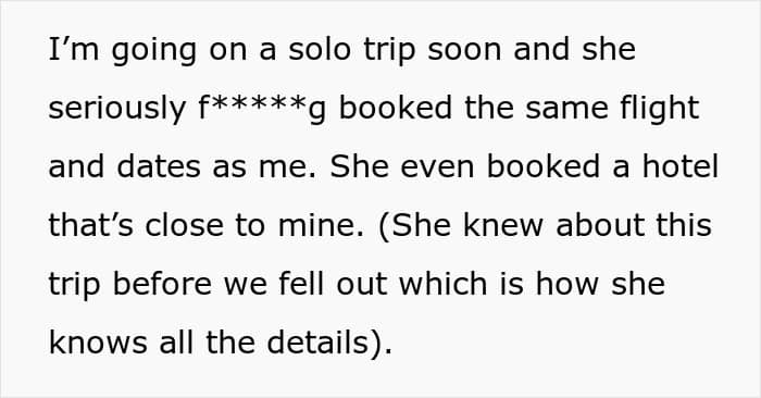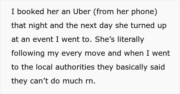 From showing up uninvited at events to booking the same flight and announcing her desire to join a trip, the ex-friend’s actions have crossed an increasing number of boundaries. The worst part is that local authorities are not yet willing to help.