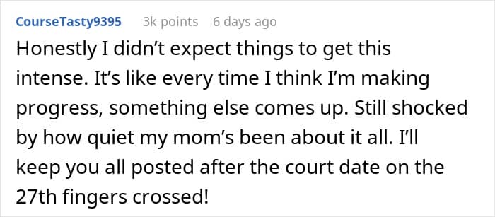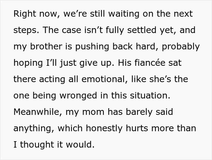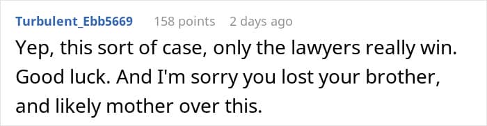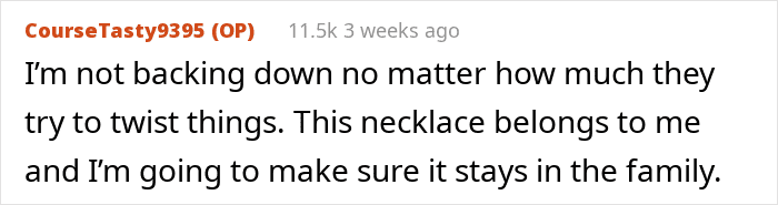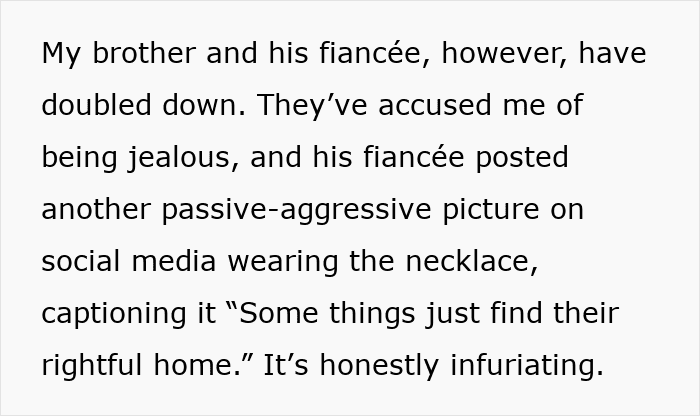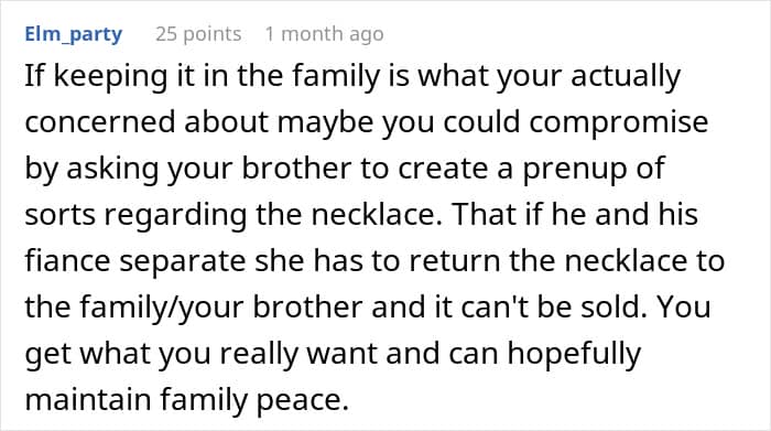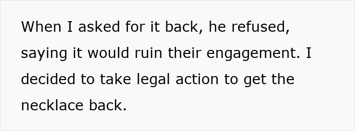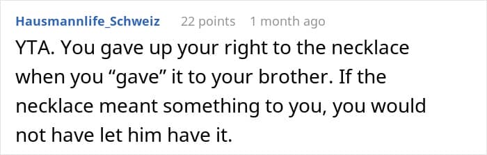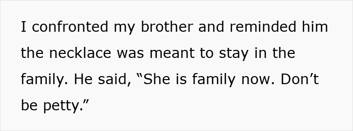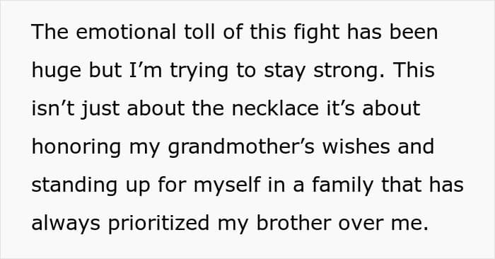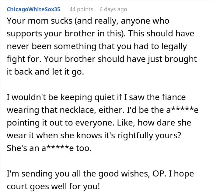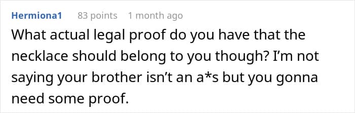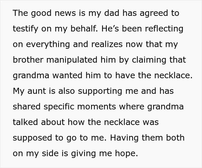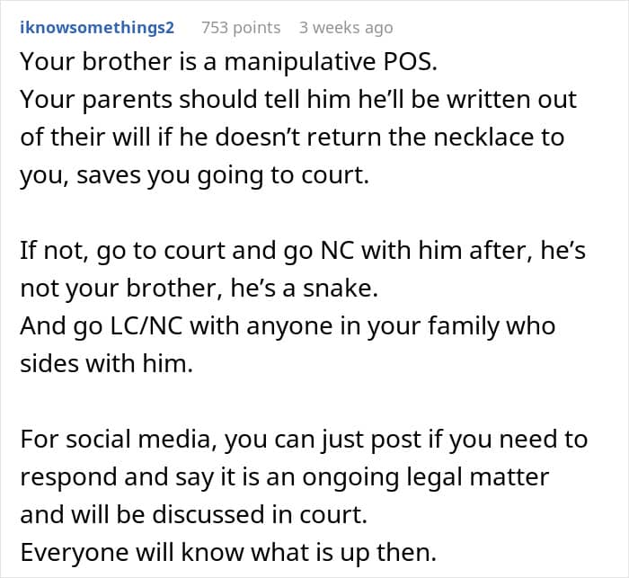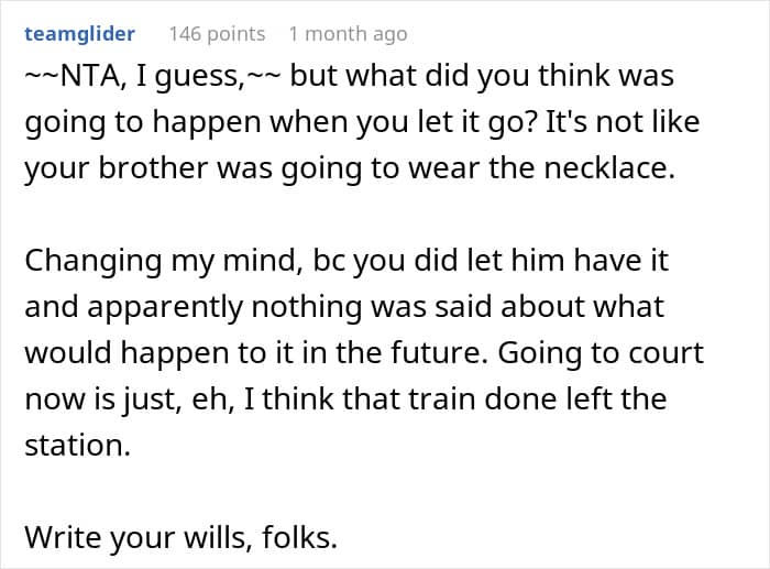 This is perhaps why, in one of the updates (the story continues below) the mom suggests dropping the entire thing. After all, at the end of this no matter who “wins,” the court decision, it will be a long-standing family issue for years to come. This means that it is seriously worth considering if the value of the necklace is more than the “value” of a relationship with one’s brother.