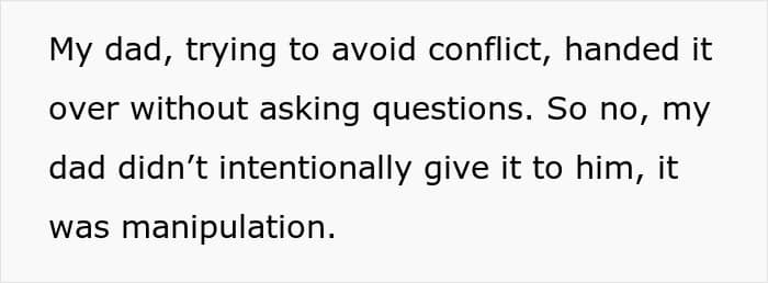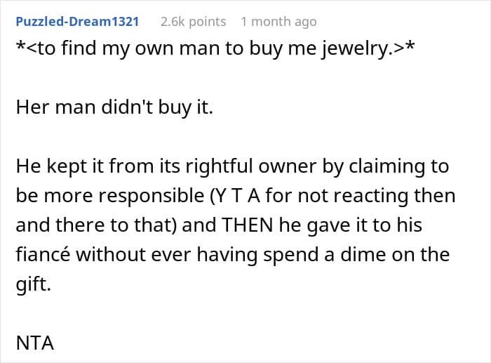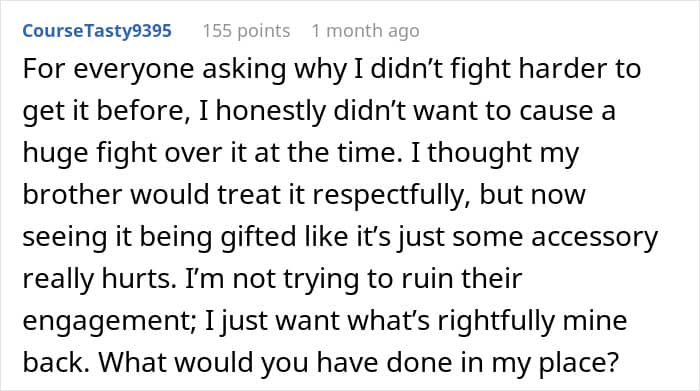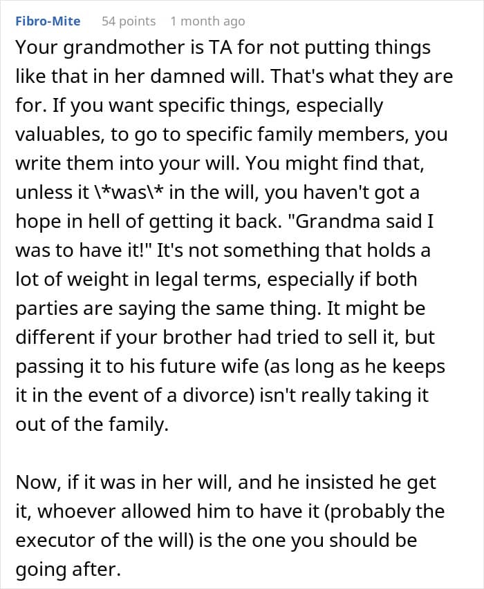 A young woman asked the internet if she went too far when she decided to take her brother to court over a family heirloom he took and gifted to his girlfriend. Later she shared a sizable update. We reached out to the woman who made the post via private message and will update the article when she gets back to us.