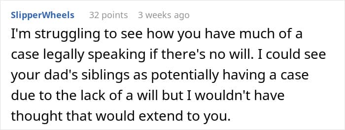 The young woman who made the post didn’t indicate where she is from, which can make it hard to understand exactly what rules do and don’t apply to her situation. While some believe that, in the absence of a “real” will, there is no telling who gets what, the reality is that oral (nuncupative) wills also exist.