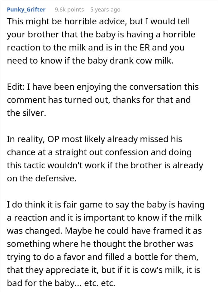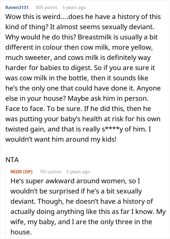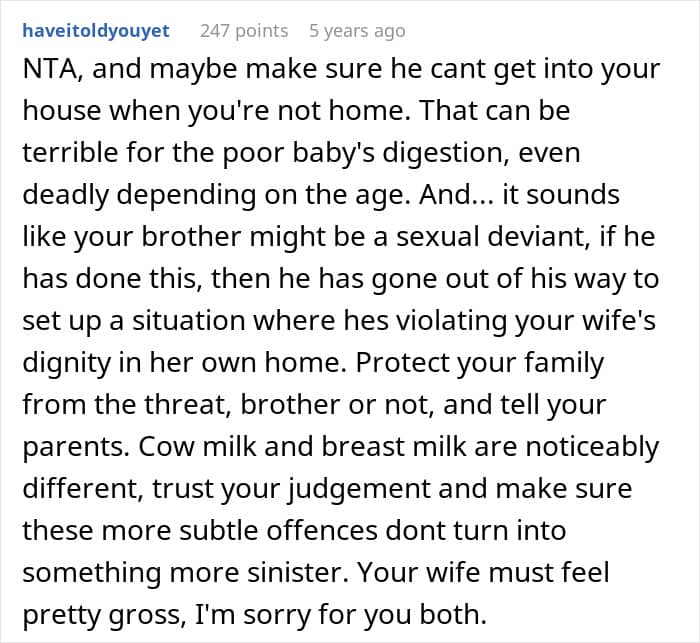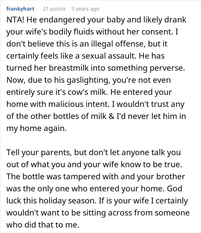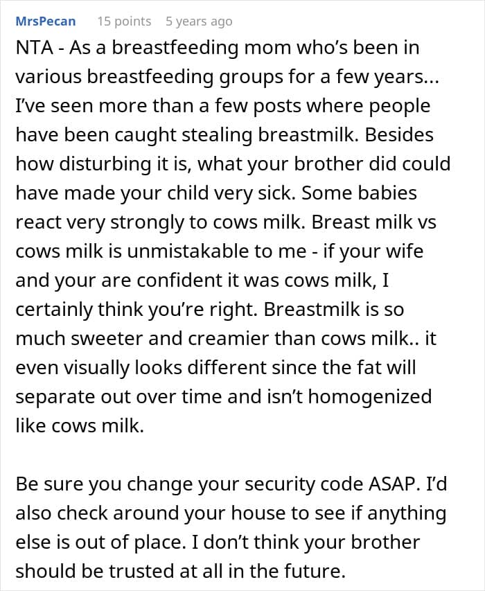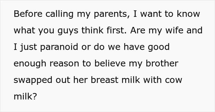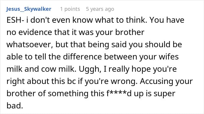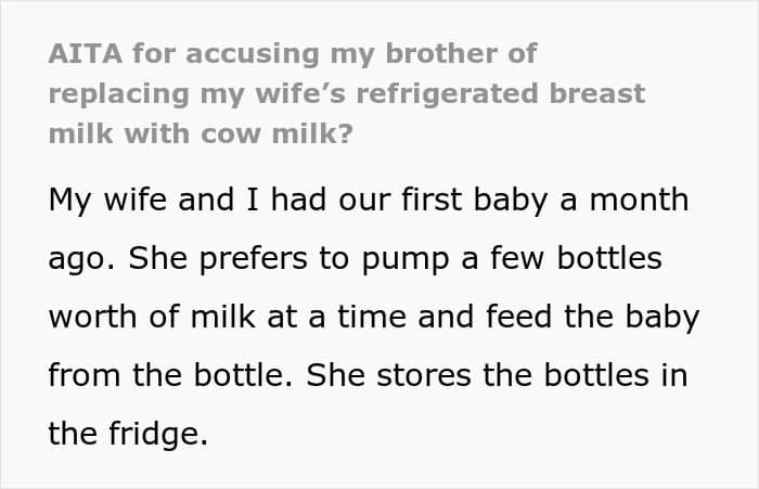 In today’s story, a man suspected his younger brother of stealing his wife’s breast milk and swapping it with cow’s milk. He confronted his little sibling, who denied the accusations and refused to apologize.