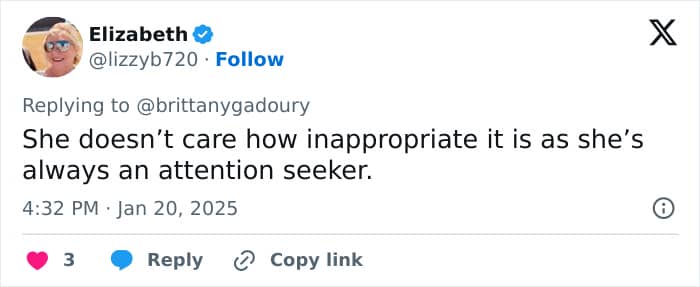 “All that money and that’s the best you got?” one user wrote, echoing the sentiments of hundreds who felt the outfit, which prominently displayed her breasts, was inappropriate for the occasion.